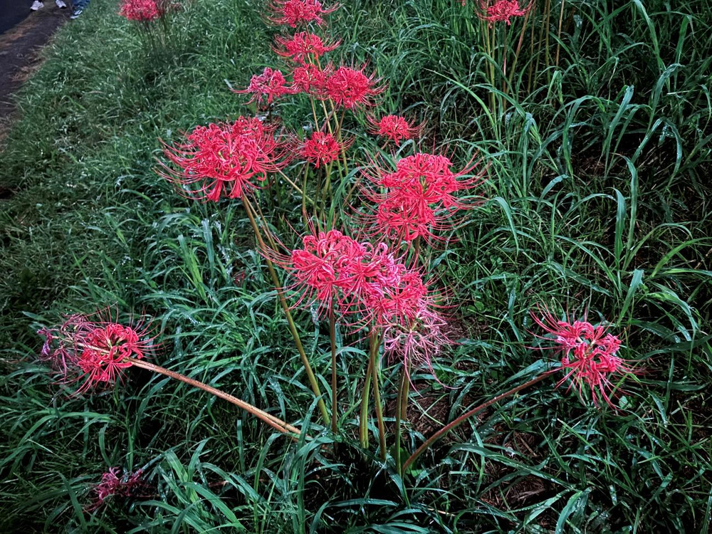花火大会終了後、秋を感じる夜風に当たりながら、河川敷を降りると多くの彼岸花が咲いていました。