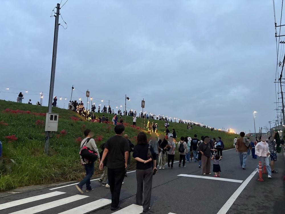 目の前の土手を登れば、いよいよ会場です。