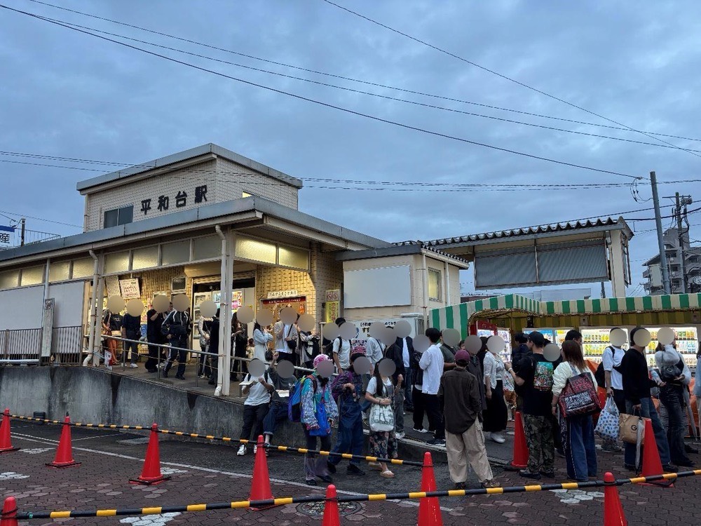 こちらは、17時過ぎの駅出入口の写真です。駅前には乗客が並ぶためのポールが張り巡らされ、混雑している様子が伺えます。