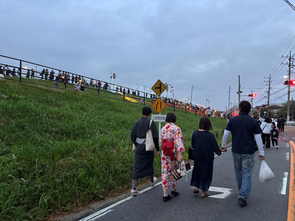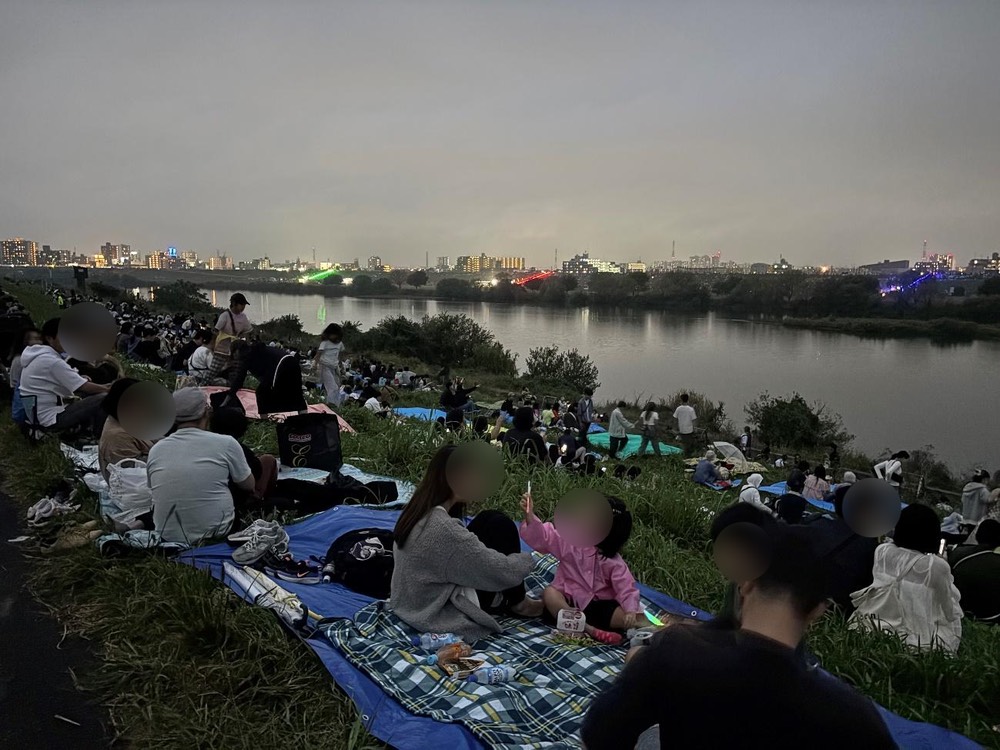 土手を登ると、既に多くの人がレジャーシートを広げて花火を待っていました。