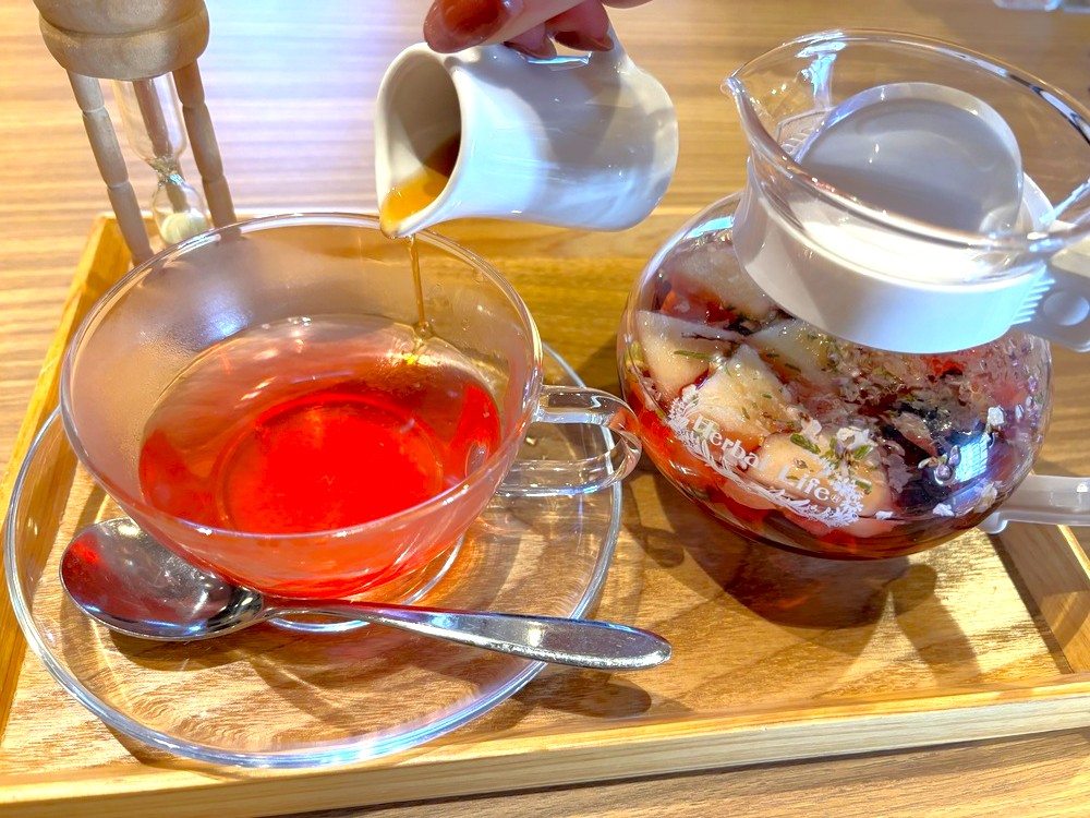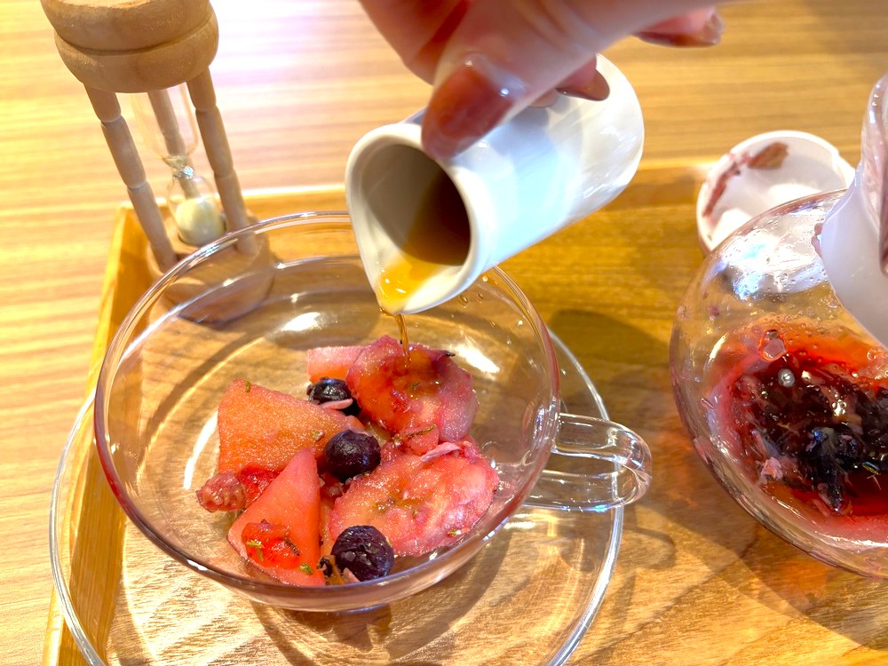 フルーツティーを楽しんだ後は、ポットに残ったフルーツに白みりんシロップをかけていただくことができるそうです。