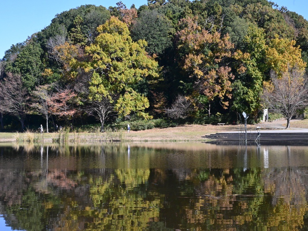紅葉した木々が水面に映し出されていて、とてもキレイです!こちらの方は、遊具があるエリアが近いので、子連れファミリーの姿が目立ちました。