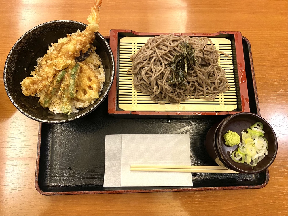 今回はお風呂に入る前に、ざるそばとミニ天丼のセットを注文しました。