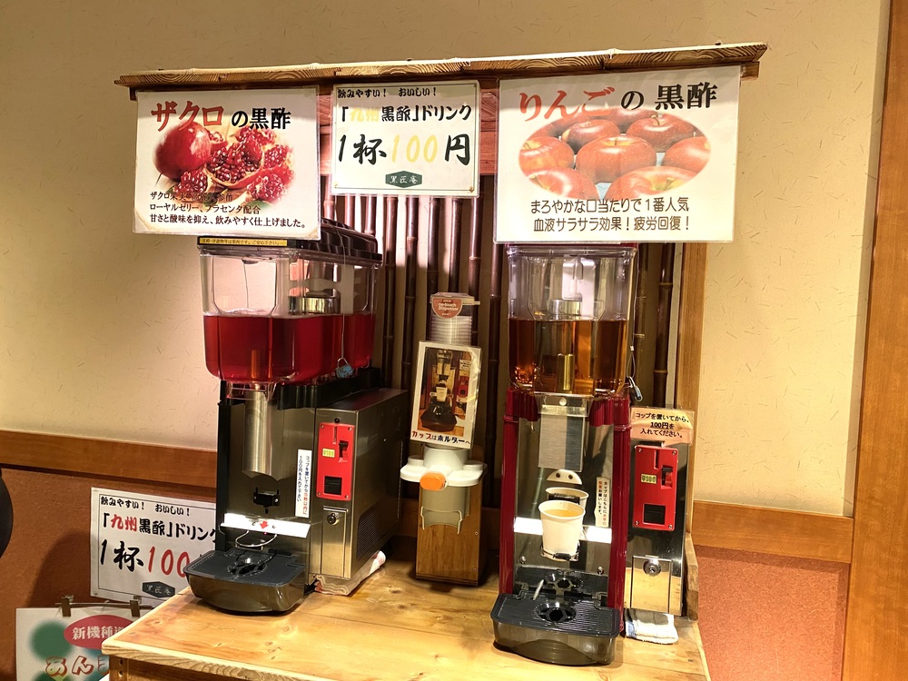 お風呂から出ると、ザクロの黒酢ドリンクとりんごの黒酢ドリンクがあったので、りんごの黒酢ドリンクを100円で購入。