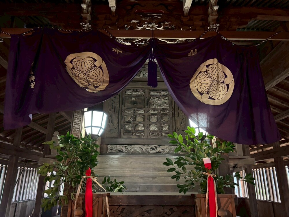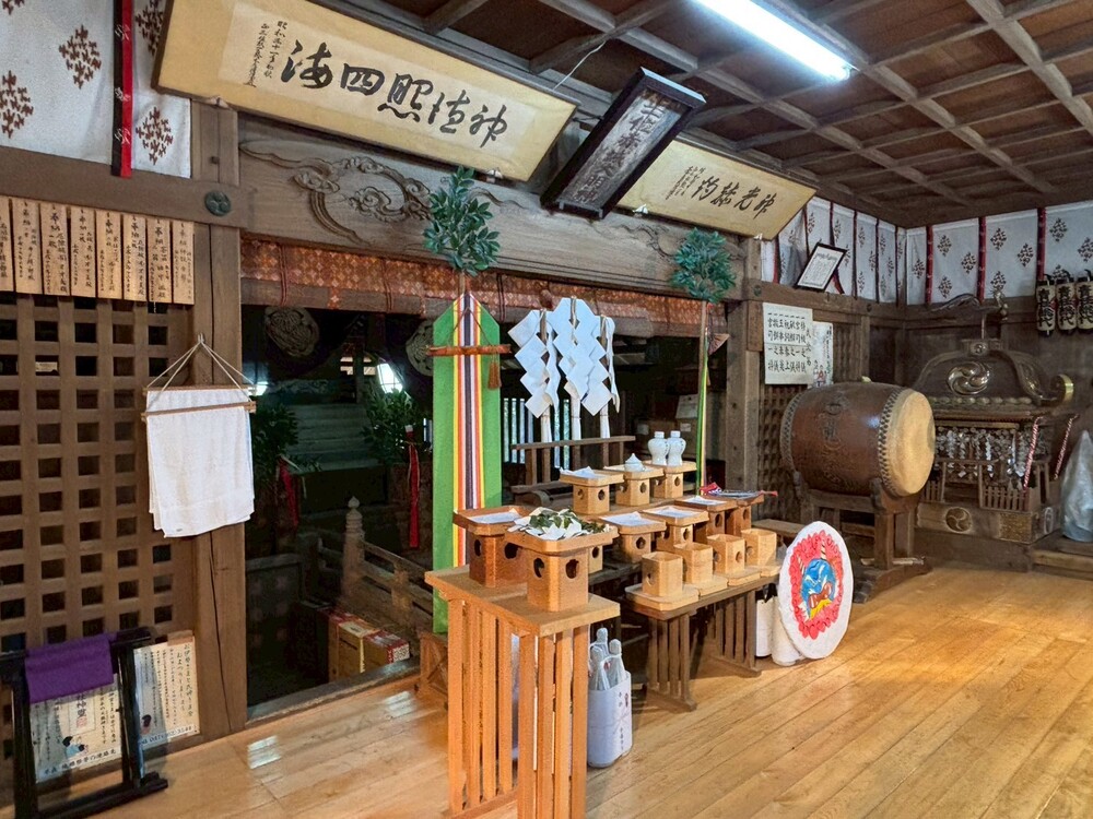 拝殿の中には、祭壇だけでなく御神輿、和太鼓などがありました。