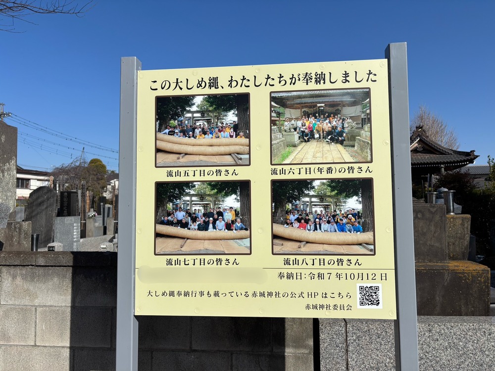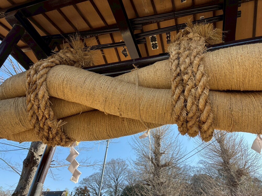 赤城神社の大しめ縄、「流山市指定無形民俗文化財」にも登録されていて、長さ約6.5メートル、太さ約 1.5 メートル、重さは約 500 キログラムにもなるそうで す。